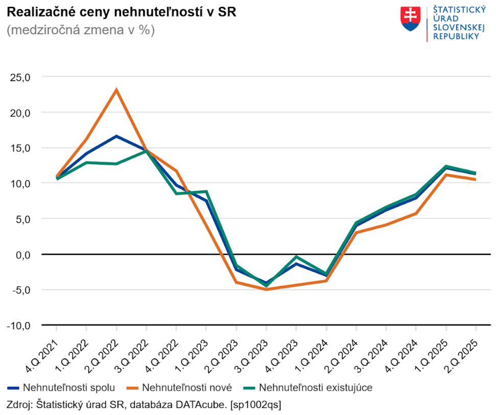 Realizačné ceny nehnuteľností určených na bývanie na Slovensku v druhom štvrťroku 2025 vzrástli medziročne o 11,3 percenta. Medzikvartálne išli hore o 2,2 percenta, pričom rýchlejšie zdraželi nové nehnuteľnosti o 2,9 percenta. Ceny existujúcich domov a bytov sa zvýšili o 2,0 percenta. Vyplýva to z údajov Štatistického úradu SR.