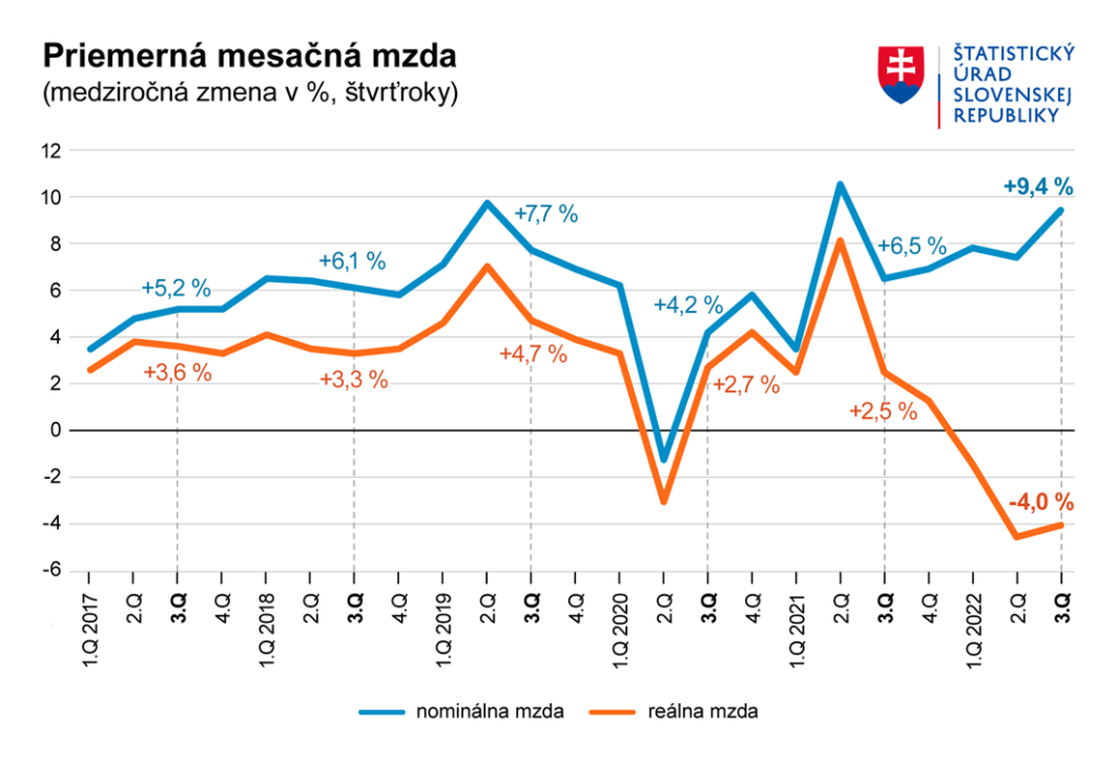 Ani takmer desaťpercentný rast miezd na Slovensku nestačí pokryť vysokú infláciu. Ako informoval Štatistický úrad SR, priemerný mesačný plat zamestnanca v hospodárstve SR stúpol počas 3. štvrťroka 2022 medziročne o 9,4 % na 1 296 eur. Napriek tomu priemerná reálna mzda klesla o 4 %.