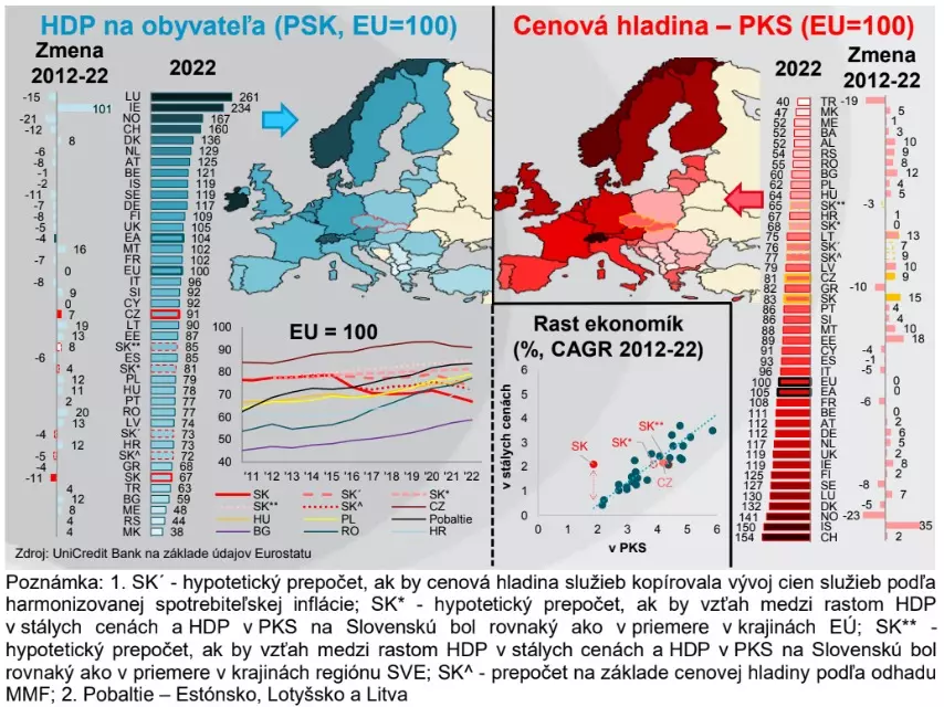 oficiálnych štatistík Eurostatu, zaostávali za cenami na Slovensku. Tie minulý rok dosiahli až 83,1% priemeru EÚ. Vyššia cenová hladina pritom štatisticky znižuje HDP v parite kúpnej sily. Zdá sa pritom, že práve Slovensko by mohlo byť extrémnym príkladom „nezvládnutého“ odhadu cenovej hladiny. K významnému posunu cenovej hladiny smerom k priemeru EÚ došlo najmä po roku 2015, a to predovšetkým v dôsledku zmeny metodiky. Cenová hladina na Slovensku sa medzi rokmi 2015 a 2019 priblížila k priemeru EÚ až o 10 pb, čo bolo v danom období jednoznačne najrýchlejšie tempo približovania sa spomedzi všetkých krajín EÚ. Štatistiky inflácie, či už spotrebiteľskej alebo výrobcov, takéto rýchle tempo ale nenaznačovali.