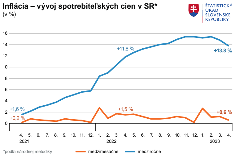 V apríli dosiahla medziročná miera inflácie úroveň 13,7 percenta. Klesla tak druhý mesiac po sebe. Informoval o tom Štatistický úrad SR.