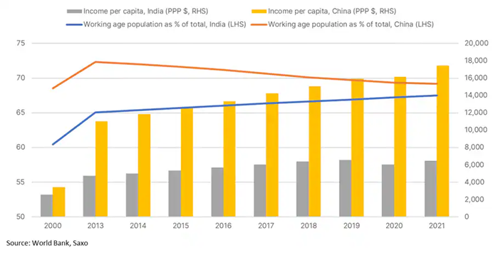 Populácia Indie nedávno prekonala dlho očakávaný inflexný bod a predbehla Čínu v statuse najľudnatejšej krajiny na svete. Podľa odhadov OSN bude mať India už tento rok 1,428 miliardy ľudí, čo je asi o 3 milióny viac ako má Čína. India má okrem populačnej dynamiky aj rastúcu populáciu v produktívnom veku. Viac ako polovica populácie má menej ako 30 rokov. To je v ostrom kontraste s inými rozvinutejšími ázijskými krajinami, ktoré zaznamenávajú pokles populácie v produktívnom veku ako dôsledok starnutia populácie.