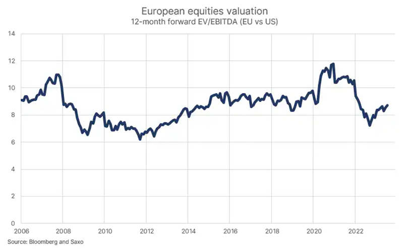 Nižší ekonomický rast v Európe ovplyvnil aj rast firemných ziskov. 12-mesačný kĺzavý ukazovateľ EBITDA vyvrcholil v 3. štvrťroku 2022 a odvtedy kontinuálne klesá, vrátane posledného ukončeného druhého štvrťroka 2023. „Tento vývoj v kombinácii s nadšením z technológie AI, z ktorej profitujú americké technologické akcie, posunuli valuácie európskych akcií smerom k najväčšiemu diskontu voči americkým akciám od januára 2006. Investori oceňujú európske akcie s 35 % diskontom pri pohľade na očakávania počas nasledujúcich 12 mesiacov,“ komentuje situáciu akciový stratég Saxo Bank Peter Garnry. To na jednej strane odzrkadľuje, že investori nikdy neboli negatívnejšie naladení voči Európe v porovnaní s USA, na strane druhej to môže viesť k situácii, že európske akcie môžu prevážiť v portfóliu odvážnejších investorov a to napriek problémom na starom kontinente.