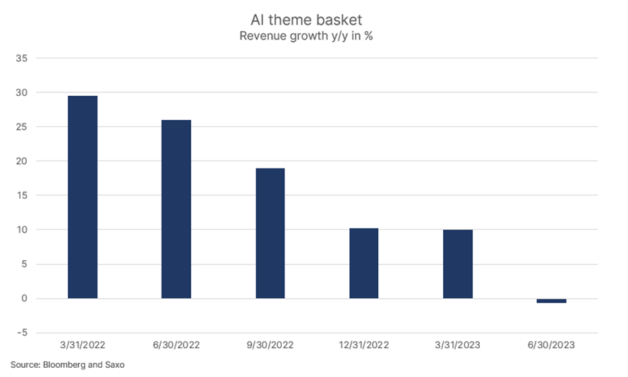Akcie v tematickom koši Umelá inteligencia (AI) Saxo Bank sa nedávno ocitli pod tlakom. Výsledková sezóna za 2. štvrťrok ukázala, že medziročný rast tržieb pokračoval v poklese, čo znamená, že AI ošiaľ sa nateraz do výsledkov nepretavil. Finančný riaditeľ Microsoftu na margo výsledkov povedal, že predaje založené na AI budú postupné, nie nárazové.