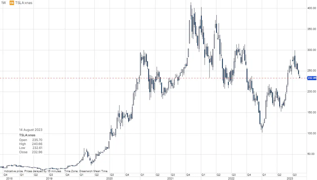 Tento vývoj sa odzrkadľuje aj na akciách Tesly. Tesla má za sebou skvelý rok v porovnaní s očakávaniami z úvodu roka, kedy sa rozozneli sirény ohlasujúce pravdepodobnú recesiu kvôli rastu úrokových sadzieb. Hoci jej akcie klesli z júlových maxím na úrovni 300 USD o viac ako 20%, stále sú o neuveriteľných 89 % vyššie ako pred rokom. Keďže Tesla je stále vnímaná skôr ako technologická spoločnosť, než automobilka, akcie Tesly sa zviezli na tohtoročnej AI technologickej rally. Pomohlo tomu aj pokračujúce vysoké tempo rastu predaja elektrických vozidiel.