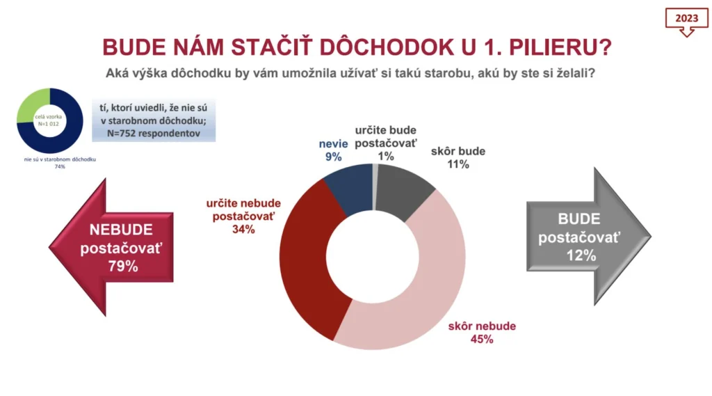Na druhej strane, tretina (35 %) ekonomicky aktívnych očakáva, že štátne dôchodky budú v budúcnosti ešte nižšie, a ďalších takmer 30 % verí, že sa nezvýšia ani oproti dnešku. Viac ako polovica (52 %) pracujúcich by pritom chcela zavesiť prácu na klinec omnoho skôr, než by formálne museli. No väčšina z nich (79 %) neverí, že by im štátna penzia pokryla náklady na bežný život. Ľudia tak zároveň predpokladajú, že vek odchodu do dôchodku sa pri ich generácii posunie ešte vyššie, takže bez vlastných úspor alebo investícií môže zostať všetko len pri snoch a dobrých predsavzatiach.