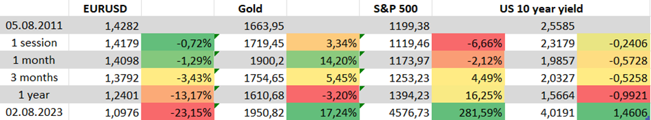 Stav hospodárstva bol vtedy samozrejme iný. Úrokové sadzby boli stále na nule a Fed sa nachádzal medzi jedným programom nákupu aktív (QE) a druhým. Okrem toho prebiehala európska dlhová kríza, ktorá pozitívne ovplyvňovala americké aktíva, a nakoniec americký index S&P 500 v priebehu 12 mesiacov od rozhodnutia S&P získal približne 20 %.