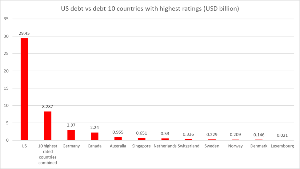 Súčasný trh s dlhom USA je takmer päťkrát väčší ako celkový trh všetkých ostatných vládnych emitentov s ratingom AAA od všetkých agentúr a takmer štyrikrát väčší vzhľadom na krajiny s prevládajúcim ratingom AAA. Kam by teda peniaze z amerického dlhu putovali, keby ich manažéri chceli mechanicky presunúť? Aj keby americký dlh nemal pre danú inštitúciu osobitné postavenie (čo sa často stáva), bolo by jednoduchšie zmeniť ustanovenia ako skutočne opustiť americké dlhopisy. Mimochodom, táto skutočnosť tiež znamená, že dlh vlád, ktoré si zachovali AAA, môžu investori mimoriadne oceňovať (keďže ho zostalo tak málo).
