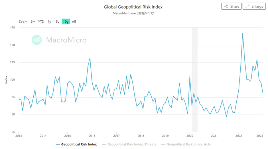 Rok po vypuknutí ruskej invázie na Ukrajinu, v rastúcom napätí medzi USA a Čínou a s citeľnou nervozitou na Mníchovskej bezpečnostnej konferencii to vyzerá tak, že aj akciové trhy musia brať do úvahy rastúce geopolitické riziká. „Ak sa Čína rozhodne Rusku poskytnúť zbrane, potom sa globalizácia, ako ju poznáme dnes, skončila a dodávateľské reťazce sa opäť ocitnú v chaose,“ hovorí Peter Garnry, akciový stratég Saxo Bank . Index geopolitických rizík, ktorý zostavujú ekonómovia Fedu Dario Caldara a Matteo Lacoviello, ukazuje, ako geopolitické riziko klesalo od začiatku ruskej invázie na Ukrajinu, čo zdôvodňuje súčasnú spokojnosť na akciových trhoch. „Ak sa však na geoipolitické riziká pozrieme zo širšej perspektívy, uvidíme, že ak by sa vojnová situácia na Ukrajine zhoršila, trhy budú čeliť značným rizikám,“ vysvetľuje odborník Saxo Bank.