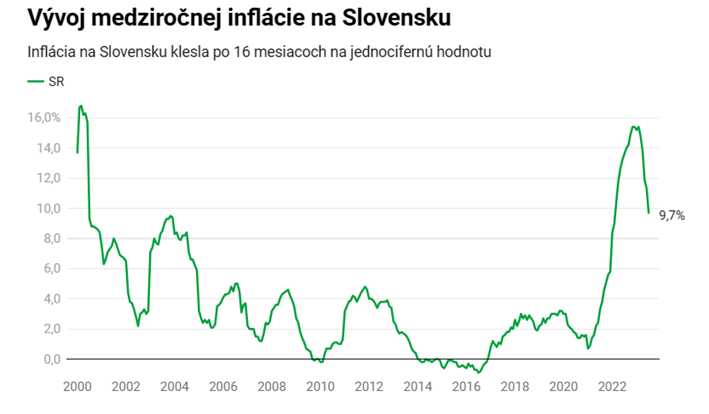 Inflácia na Slovensku v júli klesla na 9,7 % a po 16 mesiacoch dosiahla jednocifernú hodnotu. Klesla tak už 5. mesiac v rade. Naďalej je však najvyššia v eurozóne a jedna z najvyšších v EÚ. Jadrová inflácia dosiahla 10,6 %, čo je rovnaké tempo ako v júni.
