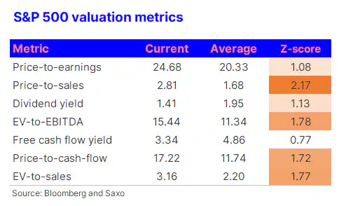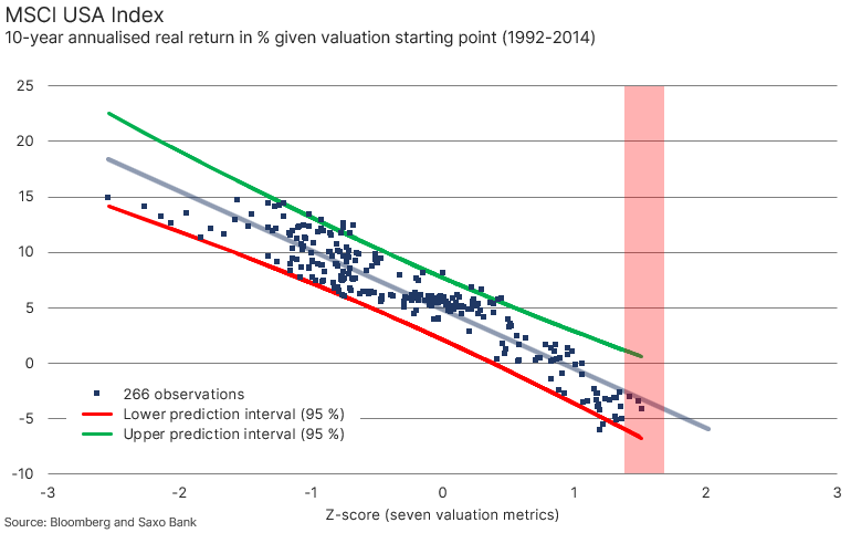 Nedávny úspech spoločnosti Nvidia a jej vyhlásenie, že generatívna AI dosiahla „bod zlomu“, však môžu byť spolu s vysokou valuáciou amerických akcií signálom, že akciový trh sa príliš zahrieva. To následne vyvoláva obavy z potenciálneho prasknutia bubliny, podobne ako tomu bolo v ére dot-com. Obdobné úrovne ocenenia v minulosti tiež viedli k záporným reálnym výnosom po zohľadnení inflácie. „Americké akcie sú teraz výrazne drahšie v porovnaní s priemerným ocenením od roku 1992. V skutočnosti americké akcie dosiahli na úroveň, ktorú sme pozorovali len počas dot-com bubliny a technologickej bubliny počas pandémie v roku 2021,“ hodnotí akciový stratég SAxo Bank Peter Garnry.