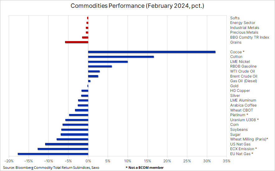 Komodity zaznamenali vo februári mierny pokles, ktorý sa ale týkal širokého spektra produktov. Celkovo index Bloomberg Commodity Total Return (BCOM), ktorý sleduje kôš 24 hlavných komoditných futures takmer rovnomerne rozdelených medzi energiami, kovmi a poľnohospodárstvom, poklesol o 1,5 %, čo predstavuje pokles štvrtý mesiac v rade. Na čele poklesu stáli obilniny, ktoré sa ponorili na trojročné minimum. Na opačnej strane spektra stálo kakao.