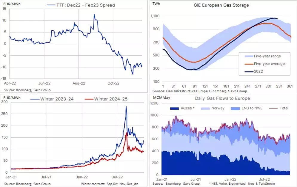 „Správa o cenovom strope napriek tomu vyvolala obavy z možného skreslenia cenových signálov a zníženia likvidity trhu, čo môže ohroziť ponuku. Môže totiž motivovať dodávateľov oneskoriť predaj,“ hovorí Ole Hansen. Vo všeobecnosti mierny a neskorý nástup zimy a silné toky LNG na starý kontinent spôsobili, že zásoby sú takmer plné, pričom ročná sezóna čerpania sa začala o 3 týždne neskôr ako zvyčajne.