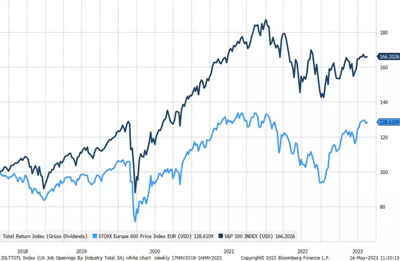 Z maximálnych úrovní akcií koncom roka 2021 klesli americké akcie o 11 %, zatiaľ čo európske akcie stratili len 3 %. Pozitívnejšie sú aj očakávané výnosy a vyhliadky ziskovosti, ktoré taktiež rastú rýchlejšie v Európe ako v Amerike. „S rozbehnutou diskusiou o dlhovom strope USA, ktorá pravdepodobne povedie ku kompromisu so znížením deficitu USA, by sa rok 2023/24 mohol stať obdobím nižších vládnych impulzov pre rast v USA v porovnaní s Európou,“ vysvetľuje Peter Garnry, akciový stratég Saxo Bank.