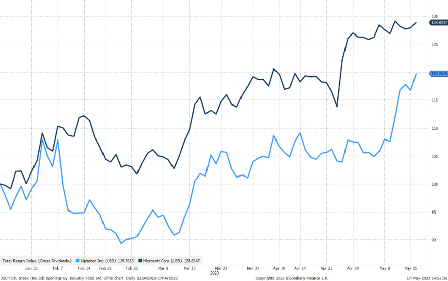 Preteky v oblasti AI sa naozaj rozbehli 23. januára 2023, keď Microsoft ohlásil investíciu 10 miliárd dolárov, čo je tretia a najväčšia investícia do OpenAI po investíciách v rokoch 2019 a 2021. ChatGPT za prvé dva mesiace od uvedenia na trh zasiahol 100 miliónov používateľov, čo sa považuje za najrýchlejšie prijatie produktu v histórii vôbec. Odvtedy sa trhová hodnota Microsoftu zvýšila o 521 miliárd USD, čo odráža veľké očakávania trhu.