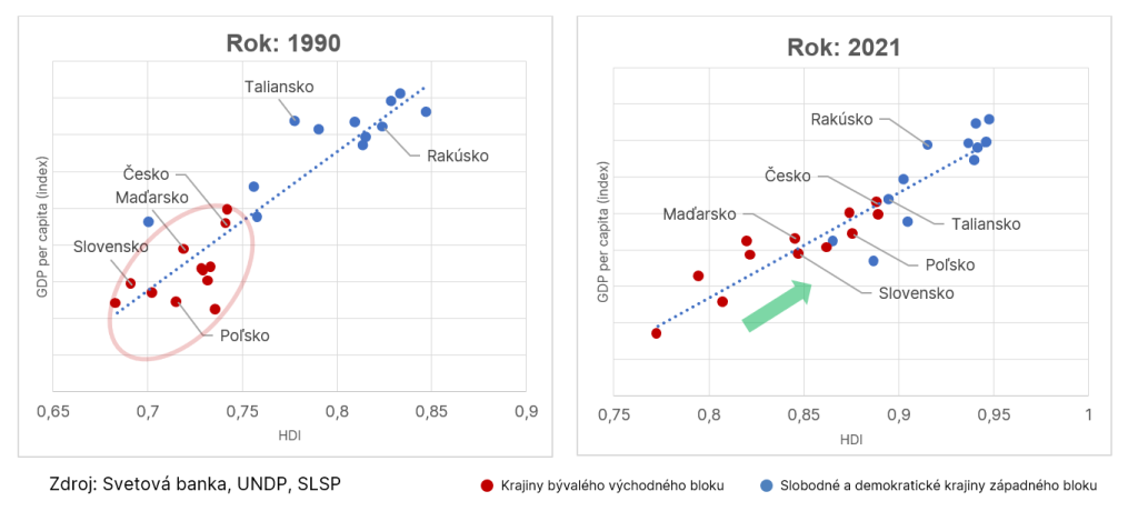Po viac ako tridsiatich rokov sú rozdiely stále viditeľné voľným okom a nie len v dátach. Pri porovnaní pozícií vybraných európskych krajín v rokoch 1990 a 2021 v grafe vyššie vidíme, že postkomunistické krajiny nižšie HDP na hlavu a nižšiu úroveň ľudského rozvoja v indexe HDI. Splácame tak daň za 40 rokov neslobody.