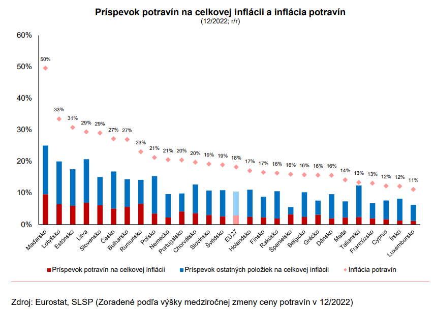 V decembri 2022 dosiahla medziročná harmonizovaná inflácia na Slovensku 15 % a za celý uplynulý rok bol priemerný nárast cenovej hladiny na úrovni 12,1 %. Priemerná medziročná inflácia v Európskej únii bola v decembri 10,4 %. Z pohľadu európskej dvadsaťsedmičky sme tak patrili ku krajinám, kde ceny rástli nadpriemerne. Celková inflácia bola ťahaná najprv výzvami, ktoré prinieslo postpandemické hospodárske oživovanie ekonomík (problémy v dodávateľských reťazcoch). Následne to boli najmä ceny energií, ktoré po ruskej agresii voči susednej Ukrajine raketovo rástli. Toto všetko sa v konečnom dôsledku podpísalo na vysokom raste cien potravín, ktorých výroba je energeticky priamo aj nepriamo náročná.