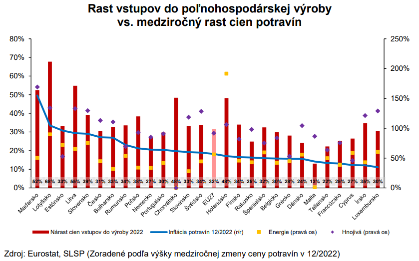 Druhým faktorom je samotný rast cien, ktorý je u nás vyšší. Za vyšším absolútnym medziročným rastom potravín vidíme predovšetkým medziročne zvýšené ceny vstupov do poľnohospodárskej výroby. Podľa dát z odhadu Eurostatu vzrástla v minulom roku cenová hladina vstupov do poľnohospodárstva na Slovensku o 39 % v porovnaní s predchádzajúcim rokom 2021, čo bolo nad priemerom EÚ (32% r/r). Najvyšší medziročný rozdiel v cene vstupov zaznamenali poľnohospodári v Lotyšsku (68 %) a Maďarsku (52 %).