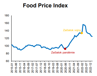 Hoci ceny základných potravinárskych komodít podľa Indexu cien potravín (Food Price Index FAO, Organizácia pre výživu a poľnohospodárstvo) sú už pod úrovňou spred vypuknutia vojny na Ukrajine (nominálne aj reálne), očakávame, že v cenách potravín sa budú u nás v tomto roku naďalej odzrkadľovať nepriame dopady vysokých cien energií kvôli oneskoreného prenosu nákladov. Ceny energií na medzinárodných trhoch klesli tiež, do konečných cien sa to však pretaví iba postupne. Výrobcovia ešte stále platia zvýšené ceny, najmä kvôli kontraktom dohodnutým v minulom roku. Ceny energií sú aj po výraznom poklese pomerne vysoko, približne na dvojnásobku oproti dlhodobému priemeru.