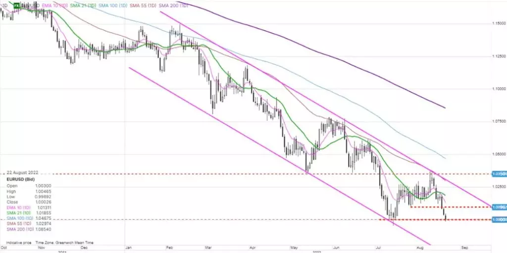 Výmenný kurz EUR/USD opäť testoval paritu. „Je to symbolická úroveň, ktorú môže mať euro ale tentokrát problém udržať. Obzvlášť, ak sa EÚ bude rútiť do recesie bez akejkoľvek vyhliadky na záchranu v prípade núdzovej energetickej situácie,“ hovorí John Hardy zo Saxo Bank.