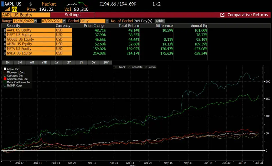 Treťou veľkou technologickou spoločnosťou bola Meta. Tá má za sebou katastrofálny rok 2022, kedy jej akcie stratili viac ako 70 %. Spoločnosť však zažíva veľký comeback a od začiatku roka akcie vzrástli o zhruba 150 %. Meta pred niekoľkými dňami zverejnila výsledky, ktoré prekonali všetky očakávania. Meta dosiahla vyššie tržby, zisk, počet užívateľov a registruje tiež rastúci dopyt po reklame. Meta tiež výrazne zvýšila svoj výhľad na aktuálny štvrťrok, ktorý v ideálnom prípade počíta s rastom tržieb až o 20 %. Akcie po zverejnení výsledkov vzrástli až o zhruba 9 %, aj keď neskôr časť ziskov zmazali. To však nič nemení na tom, že Meta patrí k najvýkonnejším akciám tohto roku.