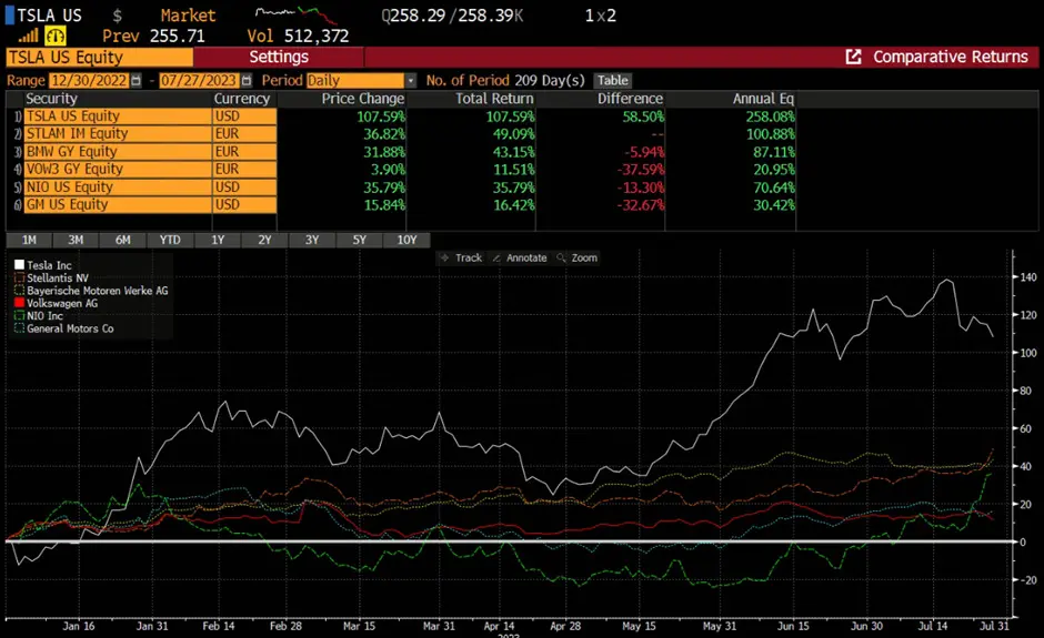 Nemôžeme zabudnúť ani na automobilky, ktoré boli aj podrobne riešené v našom najnovšom e-booku, zameranom špecificky na automobilový sektor. Svoje výsledky ohlásila aj spoločnosť Tesla, ktorá je už niekoľko rokov miláčikom akciových investorov. Tesla tiež prekonala odhady, pokiaľ ide o tržby a zisky, ale v rámci výsledkov sa objavilo niekoľko zaujímavých sprievodných komentárov. Najväčšia svetová automobilka zaznamenala nižšie marže, pretože v posledných mesiacoch musela niekoľkokrát znížiť ceny predávaných vozidiel, aby podporila klesajúci dopyt. Elon Musk v rozhovore s investormi uviedol, že je možné, že vzhľadom na stále nie celkom ideálnu ekonomickú situáciu bude Tesla v tomto postupe pokračovať, čo by mohlo marže ešte viac znížiť. Akcie na túto správu reagovali poklesom o zhruba 10 %.