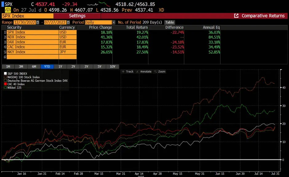 Pozrime sa najskôr na vývoj najznámejších akciových indexov. Na obrázku nižšie vidíme, o koľko % vzrástli od začiatku roka v stĺpci „Total Return“. Najznámejší americký akciový index S&P 500 vzrástol o 19,3 % a technologický index Nasdaq o 42 %. Ani európske akciové indexy sa nenechávajú zahanbiť. Nemecký DAX pridal takmer 18 % a francúzsky CAC 18,5 %. Veľmi dobre si vedie aj japonský akciový trh, ktorého index Nikkei pridal 27,5 %. Nie nadarmo začal pred niekoľkými rokmi v Japonsku investovať legendárny investor Warren Buffett!