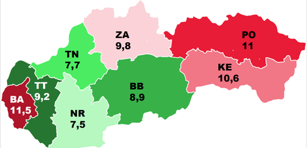 Najdrahšie nehnuteľnosti sú v bratislavskom kraji s cenou 3 138 eur za m2, kým hrubá mzda predstavuje 1 676 eur mesačne. Najlacnejšie sú v nitrianskom kraji, kde je to iba 1 454 eur za štvorcový meter pri priemernej mzde 1 150 eur v hrubom. Aj vďaka tomu sú práve v regióne Nitry rezidenčné nehnuteľnosti najdostupnejšie, keď hrubú mzdu prepočítame na čistý príjem. Práve jeho výška znižuje dostupnosť bývania napríklad v Prešovskom kraji, ktorý síce nepatrí medzi najdrahšie, no ľudia tam zarábajú menej.