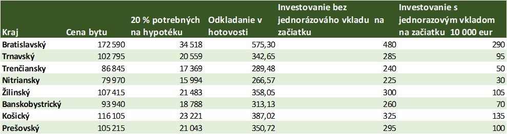 Rozumnejšie je preto peniaze odkladané na byt investovať a tak ich zhodnotiť. Ak berieme do úvahy zhodnotenie portfólia Portu s rizikovým profilom 8 (jeho investičný horizont je práve päťročný), pri neutrálnom scenári by stačilo mesačne odkladať 480 eur pri nulových počiatočných úsporách. Pri 10-tisícovom úvodnom vklade by to bolo 290 eur.