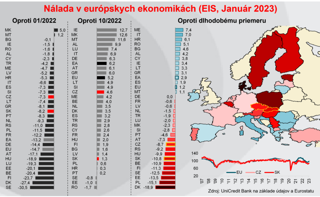 Nálada v ekonomike sa v posledných mesiacoch odrazila od dna aj na Slovensku a v Česku. Najmä v prípade Slovenska však bolo jej zlepšenie výrazne miernejšie ako v priemere v ostatných krajinách EÚ a ostávala tak výrazne horšia ako tomu bolo v priemere v minulosti. Slovensko a Česko v zásade nevybočujú z celkovej bezútešnej nálady v regióne strednej Európy, ktorá patrí (relatívne k dlhodobému priemeru) k najhorším v Európe. Okrem strednej Európy hlásia zlú náladu aj ekonomiky na severe Európy (Škandinávia). Naopak, viacero krajín na juhu Európy už v januári vykazovalo lepší sentiment ako v priemere v minulosti, dlhodobému priemeru sa nálada v ekonomike blíži aj vo veľkých ekonomikách západnej Európy – v Nemecku a Francúzsku.
