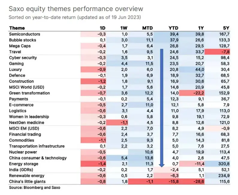 Ošiaľ okolo umelej inteligencie tlačí trh do nových extrémov. V čase vrcholiaceho pesimizmu a obáv z recesie v USA vyvolaných bankovou krízou nastal na amerických akciových trhoch nový zvrat. Približne v tomto čase totiž OpenAI prišla s GPT-4 a odvtedy už nič nie je ako predtým. Každá firma súvisiaca s umelou inteligenciou vidí, ako jej akcie vystrelili v špekulatívnej horúčke. Polovodičový tematický kôš Saxo Bank, úzko súvisiaci s AI, vzrástol do polovice marca o 17,5 % a do polovice júna o takmer 40%. Ešte pôsobivejšie si vedie tematický kôš „bublín“, ktorý počas toho istého obdobia posilnil z 8 % na 37,8 %.