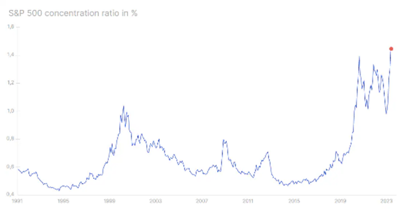 Ďalším rizikom, ktoré sa podľa neho na trh vrátilo, hoci sa očakávalo, že už nikdy nepríde, je koncentrácia akciového trhu v USA. Tento rok sa akciová rally niesla v znamení úzkej skupiny veľkých spoločností, keďže sa očakáva, že nová technológia umelej inteligencie prinesie najväčšie ekonomické zisky práve veľkým technologickým titulom. „Miera koncentrácie na americkom akciovom trhu dosiahla historicky nevídané úrovne, keď 10 najväčších firiem má na akciovom indexe S&P 500 váhu až 30,4%. Index Herfindahl-Hirschman, ktorý meria trhovú koncentráciu, dosahuje 40%, čo je nad úrovňou zaznamenanou počas vrcholu dot.com bubliny. Výsledkom je, že akciový trh v USA je krehkejší a citlivejší aj na menej rizikové faktory,“ vysvetlil odborník Saxo Bank.