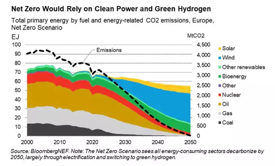 Podľa analýzy Bloomberg New Energy Finance predstavuje cesta Európy k uhlíkovej neutralite v roku 2050 investičnú príležitosť v hodnote 5,3 bilióna dolárov. Očakáva sa, že spotreba fosílnych palív sa zníži o 28 %, a to najmä vďaka prudkému zníženiu využívania uhlia pri výrobe energie. Dopyt po rope by mohol po nástupe elektrických vozidiel klesnúť o 30 % a po zemnom plyne o 5 %, keďže ide o kľúčový zdroj energie pre výrobu elektriny pre základné zaťaženie siete. Analytici vychádzajú z predpokladu, že vietor bude hlavným zdrojom primárnej energie, na čele s veternou energiou na mori, spolu s vývojom batérií a technológií elektrolýzy vodíka.