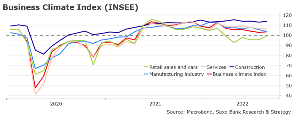 Francúzsky minister hospodárstva Bruno Le Maire v polovici septembra poprel riziko budúcoročnej recesie. Francúzska vláda cieli v tomto roku na rast HDP na úrovni 2,5 % . Na základe najaktuálnejších údajov to dáva zmysel. „Očakávaný rast HDP v roku 2023 bol revidovaný smerom nadol na 1 % v porovnaní s predchádzajúcim odhadom na úrovni 1,3 %, čo je podľa nás príliš optimistické. Keď sa pozrieme na indikátor podnikateľskej klímy INSEE a jeho hlavné zložky, spomalenie ekonomiky s výnimkou stavebníctva je už zrejmé,“ hovorí Christopher Dembik, makroekonomický stratég Saxo Bank.