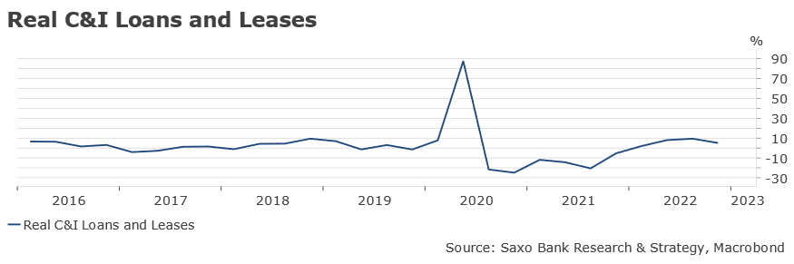 Americké banky s nedostatkom hotovosti si požičali veľké množstvo peňazí od americkej centrálnej banky. „Neveríme však, že veľa z týchto peňazí skončí v podobe nových úverov. Hlavným makroekonomickým rizikom v súčasnosti preto je, že sa rast úverov spomalí. Vo vysoko zadlženom hospodárstve, ako je aj americké, je pre hospodársky rast potrebný neustály prílev úverov,“ vysvetľuje zvýšené riziko recesie makroekonomický stratég Saxo Bank Christopher Dembik. V USA, kde kapitálové trhy zohrávajú pri úverovaní kľúčovú úlohu, banky stále dodávajú približne 40 % súkromných úverov. Sprísňovanie podmienok zo strany bánk je preto veľkým problémom najmä pre malé a stredné podniky. „Stále si myslíme, že je príliš skoro hovoriť o recesii v USA. No nová dynamika prináša riziko, že prípadnú recesiu prudko posunie vpred,“ hovorí odborník Saxo Bank.