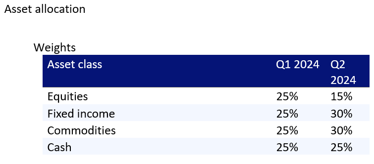 Naša investičná stratégia počas prvého štvrťroka zahŕňala vyváženú alokáciu po 25 % do každej zo 4 kľúčových tried aktív: akcie, dlhopisy s fixným výnosom, komodity a hotovosť či iné alternatívy. „Táto diverzifikácia nám dobre poslúžila, ale s prechodom do 2. štvrťroka upravujeme našu alokáciu znížením expozície voči akciám kvôli obavám z ocenenia,“ dodáva Steen Jakobsen zo Saxo Bank.