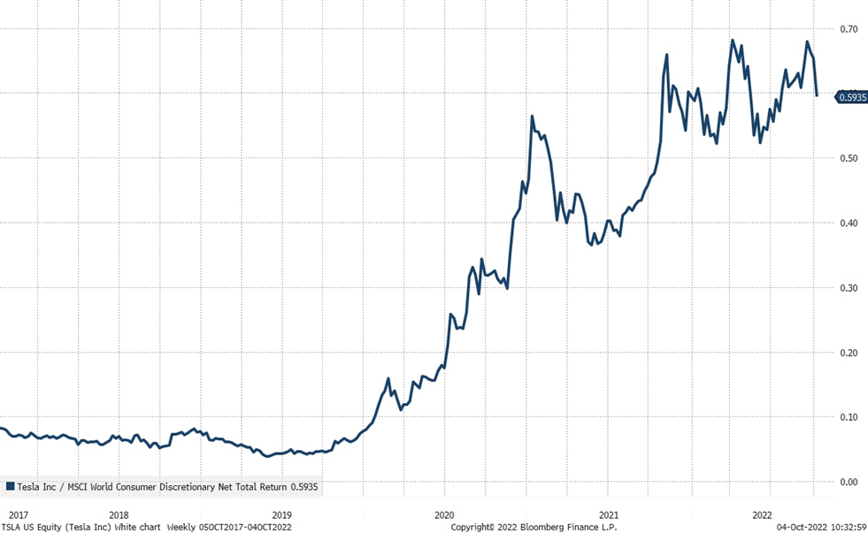 Za značnú časť týždňového poklesu akcií Tesla môže nižší odhad dodávok v 3. štvrťroku (343 830 oproti očakávaným 357 938), čo spôsobujú logistické problémy. „Okrem logistických problémov existujú pre Teslu dva ďalšie rastúce zdroje rizika. Značka bola doteraz imúnna voči kríze životných nákladov, čo viedlo k tomu, že akcie Tesla výrazne prekonávali globálny spotrebiteľský sektor. Kvôli vysokým cenám elektrickej energie a rastúcej inflácii však výrazne klesá dopyt po mnohých produktových skupín, čo už zasiahlo napríklad akcie Apple, Nike či H&M. A práve toto je pravdepodobne najväčšie riziko aj pre Teslu,“ hovorí Peter Garnry, hlavný stratég Saxo Bank pre akcie.