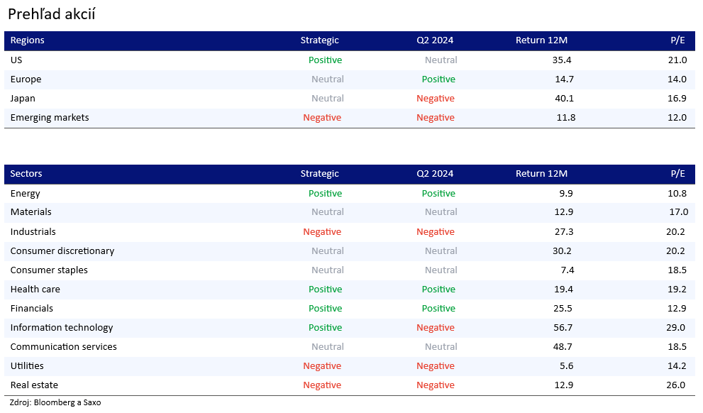 Na sektorovej úrovni je Saxo bank pozitívna voči energetike (veľká hodnota a dobré zabezpečenie proti inflácii), zdravotníctvu (silný rast v porovnaní s ocenením) a financiám (priaznivé zhodnotenie a stále dobré prevádzkové prostredie). „Negatívne sa pozeráme na priemyselné odvetvia (nízky rast a drahé), informačné technológie (príliš veľa špekulácií a humbuku v krátkodobom horizonte), verejné služby (nízka dynamika a negatívny výhľad) a nehnuteľnosti (nízka dynamika a drahé),“ dodáva akciový stratég Saxo Bank.