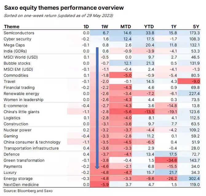 Globálne akcie za posledný týždeň mierne klesli, a to vrátane luxusného tovaru, NextGen medicíny či odvetvia skladovania energií. Výnimkou boli polovodiče, ktoré sa naopak zhodnotil o 6,7%. Dôvodom je vzrušenie a hype okolo umelej inteligencie (AI), ktoré posunuli akcie polovodičových firiem na najvyššie forwardové úrovne od januára 2010.