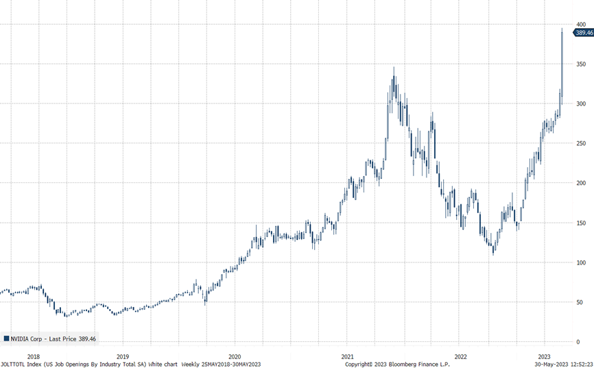 Nvidia, popredný výrobca procesorov, ktoré sa využívajú aj vo vývoji a výskume AI, je lídrom v súčasnej fáze nadšenia okolo umelej inteligencie. Jej trhová hodnota tak po prvýkrát v histórii presiahla ešte pred uvedením na trh 1 bilión dolárov. „Ocenenie spoločnosti Nvidia dosiahlo úroveň, ktorú je ťažké akceptovať v prípade, že trajektória jej rastu nedosiahne v najbližších rokoch také úrovne, ktoré sme tu ešte nemali,“ hovorí odborník Saxo Bank. Dodáva, že síce vždy existuje priestor pre jedinečnú trajektóriu a Nvidia by mohla byť práve týmto priekopníkom, ale pravdepodobnosť, že tomu tak bude, je na základe skúseností veľmi nízka. Pri 22-násobnom 12-mesačnom forwardovom výnose sú očakávania pre Nvidiu podľa Garnryho neuveriteľne vysoké .
