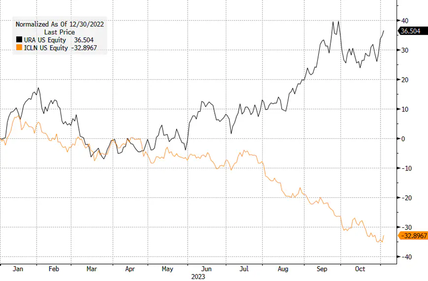 Zväčšujúca sa priepasť vo výkonnosti medzi firmami, ktoré sa zaoberajú prevažne veternou a solárnou energiou a jadrovým priemyslom je ohromujúca. Index Global X Uranium ETF s trhovou kapitalizáciou 2,3 miliardy USD sa od začiatku roka posilnili o 36,5 %, zatiaľ čo fond iShares Global Clean Energy ETF (trhová kapitalizácia 2,7 miliardy USD) stratil takmer 33 %. Nedávny vývoj tak potvrdzuje, že by sa jadrová energia mala stať väčšou súčasťou riešenia pre dekarbonizáciu hospodárstva. Ukazuje to aj príklad spoločnosti Cameco, jedného z najväčších svetových producentov uránu, ktorá zverejnila prelomové výsledky za 3. štvrťrok, vďaka ktorým cena jej akcií prudko vzrástla. Dopyt po jadrovej energii sa štvrť po štvrťroku zvyšuje.