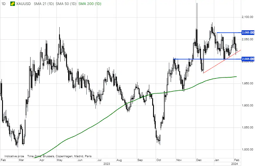 „Trh so zlatom je čoraz viac limitovaný fyzickým dopytom zo strany centrálnych bánk a maloobchodným dopytom v Číne a Indii, ako aj obavami zo situácie na Blízkom východe, ktoré poskytujú mäkkú spodnú hranicu trhu okolo 2 000 USD. Prelomenie hranice smerom nahor cez 2 065 USD vyzerá náročne, až kým nebudeme mať pevnejšiu predstavu o spomínanom načasovaní, tempe a hĺbke znižovania sadzieb,“ hovorí komoditný expert Saxo Bank.