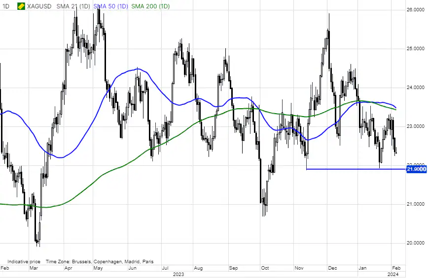 Naopak, striebro, ktoré medziročne kleslo o približne 6 %, sa opäť prudko obchoduje kvôli slabosti priemyselných kovov. „Striebro je pod vplyvom najmä zlata a medi, pričom meď je v súčasnosti negatívne ovplyvnená slabým jüanom v dôsledku obáv z ekonomického výhľadu v Číne. Podpora tesne pod 22 USD je kľúčom k tomu, aby sa zabránilo ešte väčšiemu prepadu, zatiaľ čo odpor zhora bol nastavený okolo úrovne 23,25 USD pred 50- a 200-dňovým kĺzavým priemerom,“ dodáva Ole Hansen.