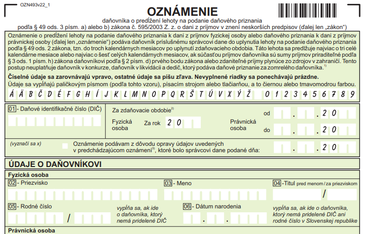 V oznámení je potrebné vyplniť v 1. riadku DIČ, fyzická osoba vedľa vyznačí, za ktorý rok chce odložiť daňové priznanie. V tomto prípade vypíše rok 2022.