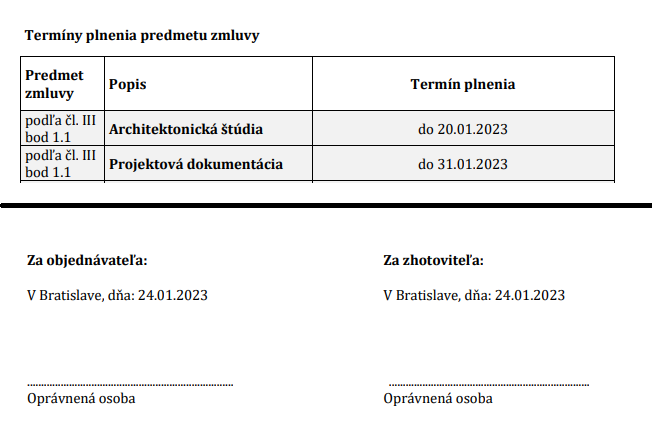Zmluva bola podpísaná 24. januára 2023. Zhotoviteľ podľa tejto zmluvy mal odovzdať architektonickú štúdiu do 20. januára 2023, teda štyri dni pred oficiálnym podpisom zmluvy. Projektovú dokumentáciu mal odovzdať do 31. januára.