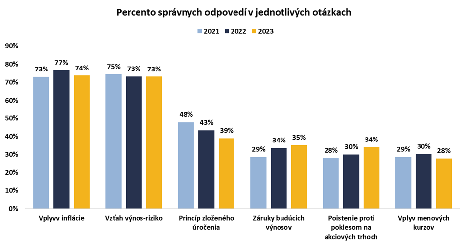 Najmenší problém majú ľudia na Slovensku s pochopením inflácie. Rozumejú jej tri štvrtiny Slovákov. Podobne sme na tom aj pri vnímaní rozdielu medzi sporením a investovaním. Na druhej strane, najväčší problém majú Slováci s menovými kurzami a s otázkami o daniach. Problém robí aj počítanie percent, garancia výnosov či pochopenie zloženého úročenia.