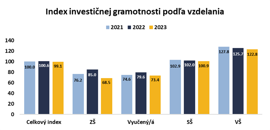 Najlepšie výsledky v investičnej gramotnosti dosiahli ľudia s vysokoškolským vzdelaním. Napriek tomu, že aj úroveň ich vedomostí mierne klesla, prepad bol výrazne menší ako pri respondentoch so základným vzdelaním. Tí si pohoršili až o 16,5 bodu.