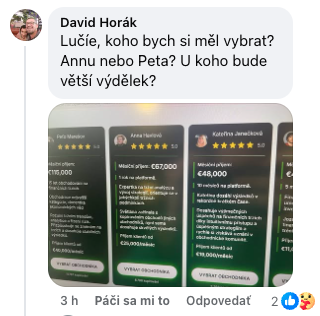 Neskôr sa nám na Facebooku zobrazilo ďalšie reklamné video, ktoré láka na kopírovanie úspešných obchodníkov s akciami prostredníctvom platformy Zlatá žila. Viaceré komentáre pod týmto videom napísali tí istí ľudia, ktorí komentovali aj predchádzajúce video. Napríklad David Novák sa pýta, ktorého tradera by si mal vybrať, aby najviac zarobil. Pri predchádzajúcom videu sa takisto pýtal, do ktorej kryptomeny má investovať. V oboch prípadoch pripojil aj fotku s ponukou, čo si možno vybrať.