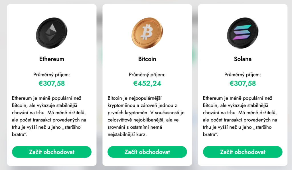 Investori majú na výber z troch kryptomien. Môžu si vybrať ethereum, bitcoin alebo solanu. Pri každom je uvedený krátky popis a priemerný príjem. Pri solane je tento popis úplne rovnaký ako pri ethereu. Najviac sa podľa týchto informácií zarába na bitcoine. Priemerný zárobok tu dosahuje viac ako 452 eur.