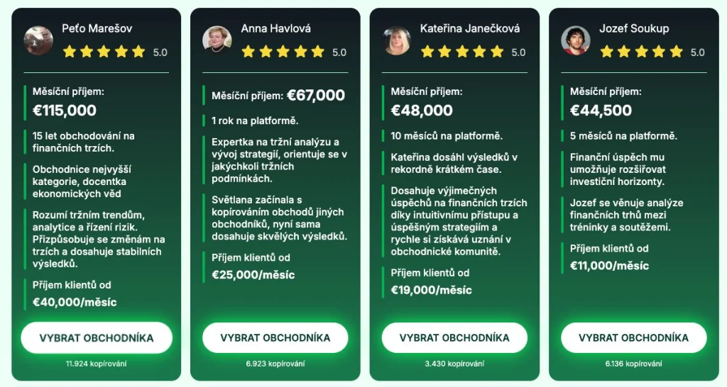 Nedostatok informácií je typický aj pre platformu Zlatá žila. Na výber sú štyria obchodníci, ktorých môžete kopírovať. Všetci majú päťhviezdičkové hodnotenie. Pri každom z nich je uvedený mesačný príjem a krátky popis. Okrem toho sa dozviete aj mesačný príjem ich klientov a počet ľudí, ktorí ich kopíruje.