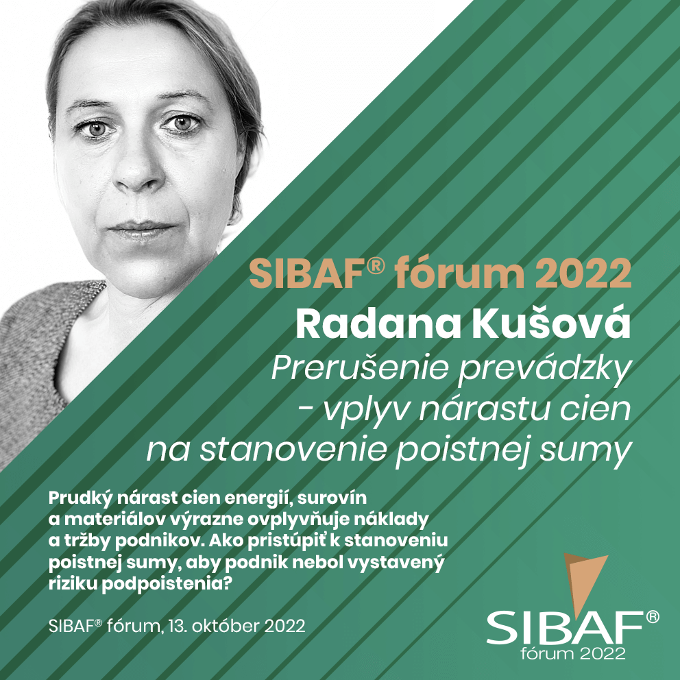 Aktuálne sa výrazne mení situácia na finančnom trhu, ba dokonca celkovo situácia v našich životoch. Zmeny, ktorými si prechádza svetová ekonomika, budú mať dopad na každého individuálne, ale aj profesne. Prudký nárast cien energií, surovín a materiálov ovplyvňuje už dnes náklady a tržby podnikov. Je to dôležitá problematika, ktorej je nutné venovať pozornosť aj z pohľadu poisťovníctva. Je potrebné vedieť, ktoré náklady sú fixné a ktoré variabilné, ale najmä, ako pristúpiť k stanoveniu poistnej sumy, aby podnik nebol vystavený riziku podpoistenia. Téme “Prerušenie prevádzky – vplyv nárastu cien na stanovenie poistnej sumy” sa bude venovať Ing. Radana Kušová, súdna znalkyňa v odbore ekonómia a manažment pre odvetvie účtovníctvo, daňovníctvo a kontroling, členka znaleckej organizácie EXPERT GROUP.